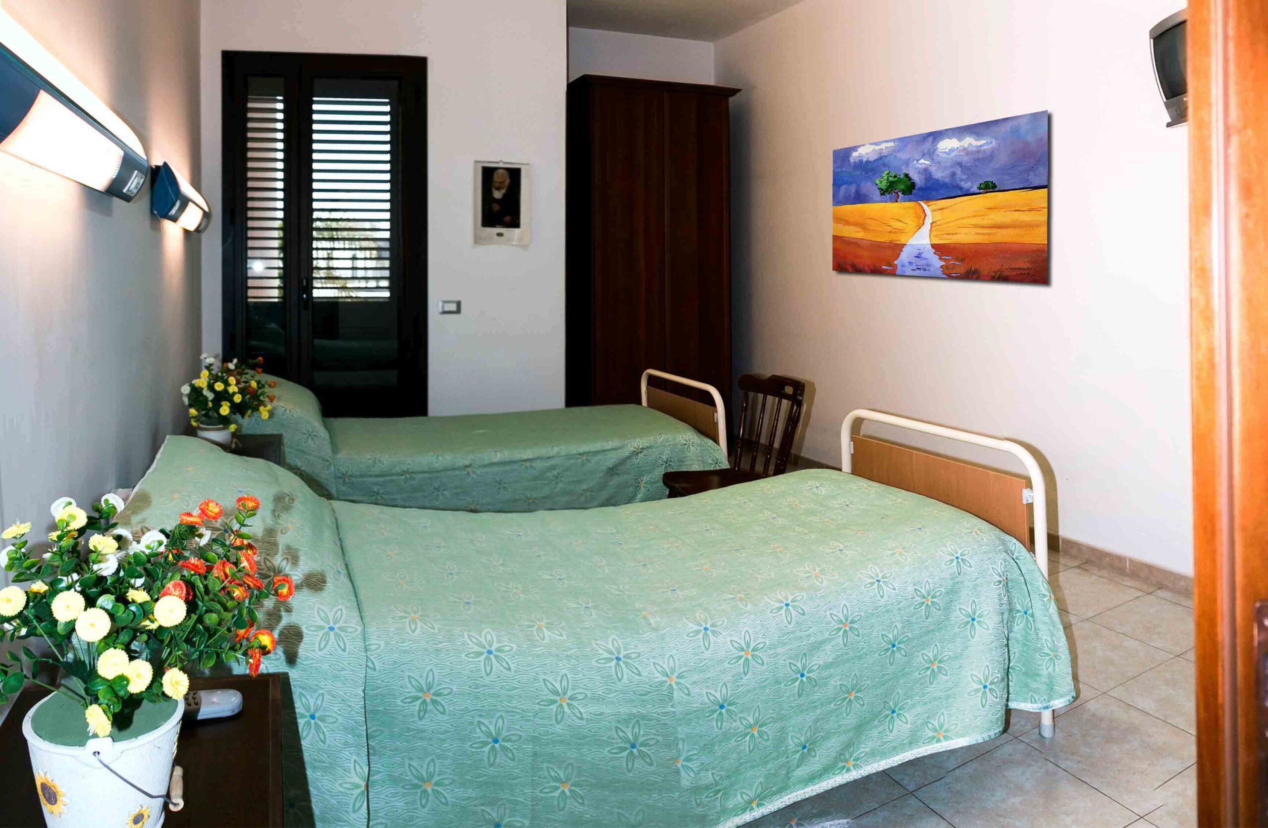 Presso la residenza per anziani salentina sono presenti delle ampie e comode camere da 2 posti letto, tutte dotate di televisione, telefono, bagno e climatizzatore. Inoltre dispongono di porta finestra e sono arieggiate. Ciascun posto letto ha un campanellino che consente di richiedere immediata assistenza al personale della struttura. I letti sono ospedalieri, confortevoli, dispongono di manovelle, spondine laterali e maniglioni anti-caduta. Ciò consente alla struttura di ospitare sia pazienti autosufficienti che semisufficienti. Gli orari delle visite vanno dalle 10:00 alle 12:00 e dalle 17:00 alle 19:00.